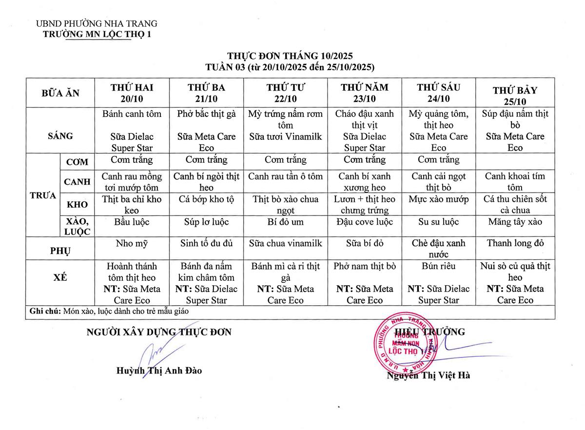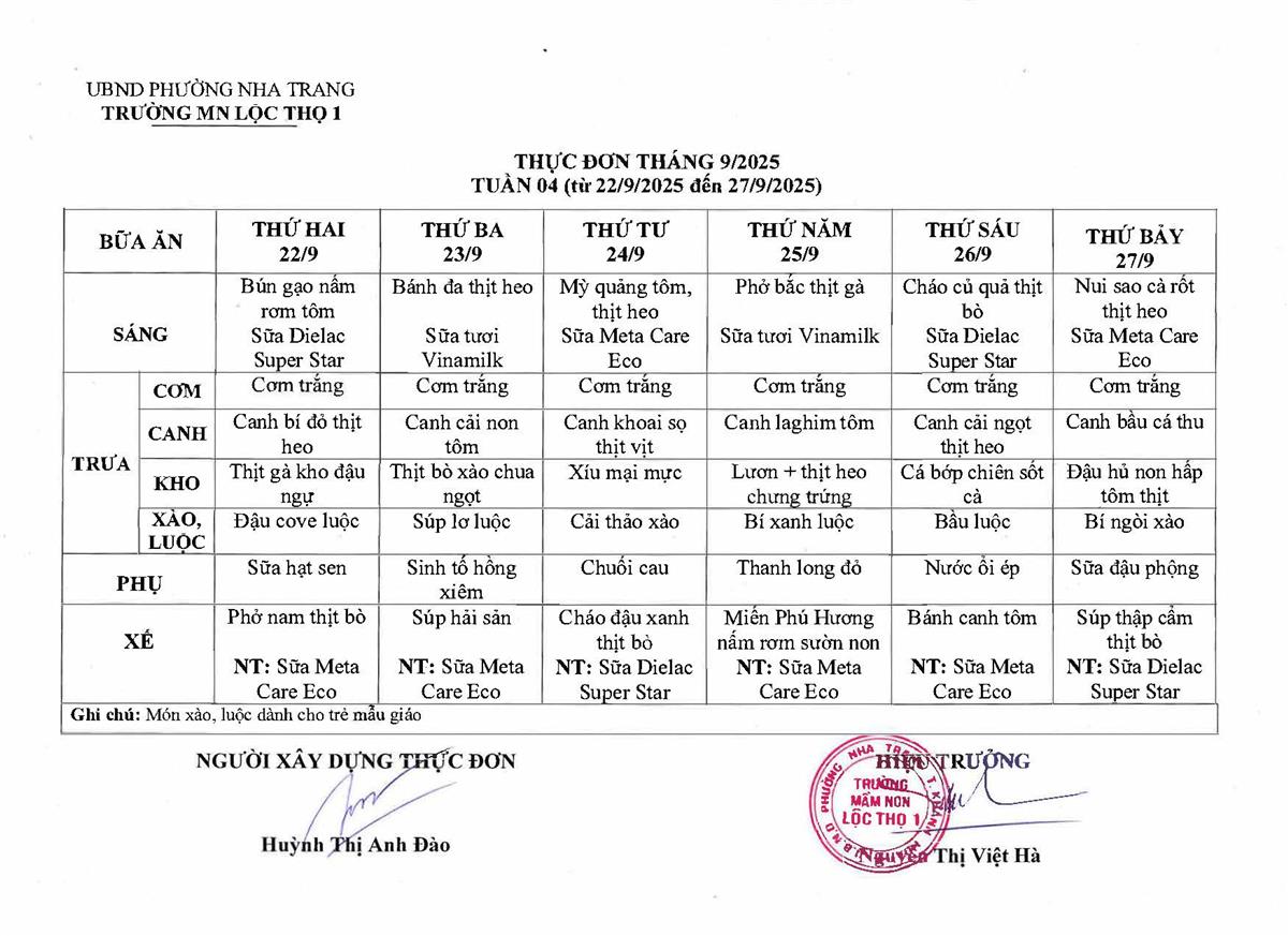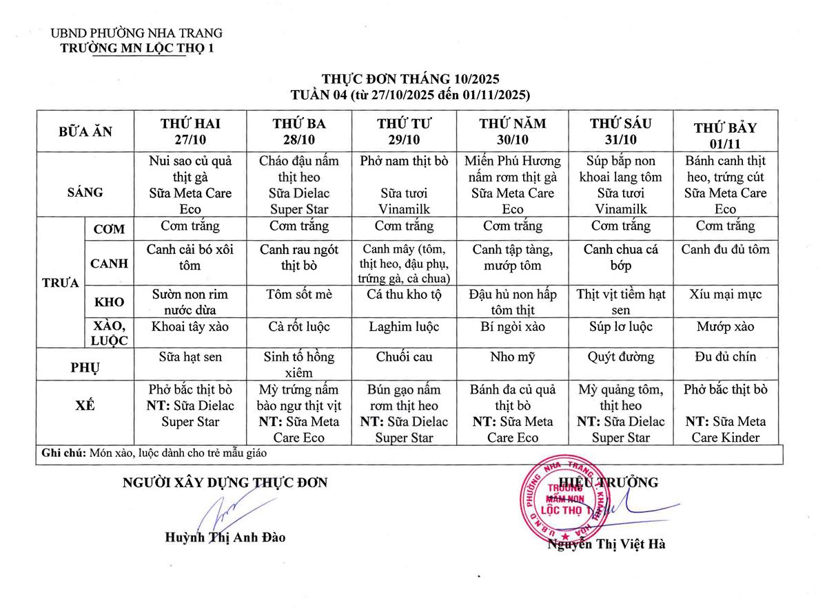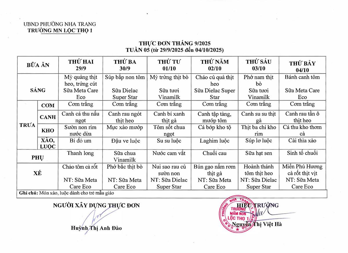 Thực đơn - Trường Mầm non Lộc Thọ 1 Nha Trang