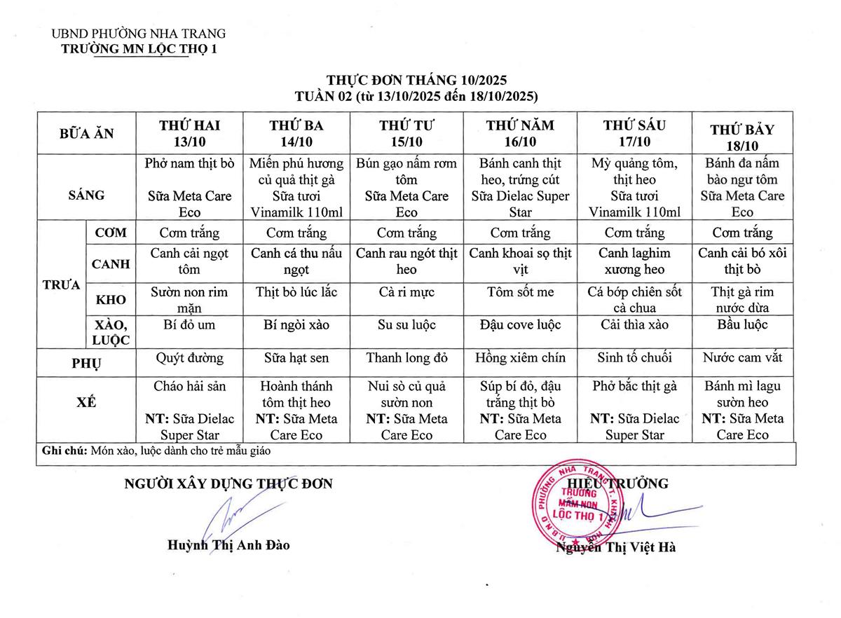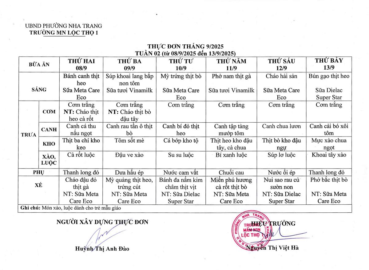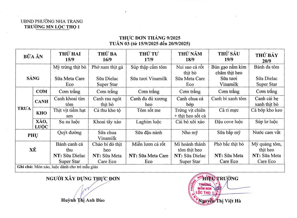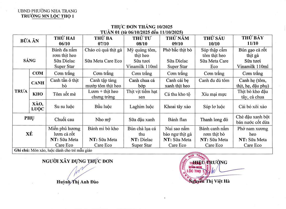Thực đơn - Trường Mầm non Lộc Thọ 1 Nha Trang