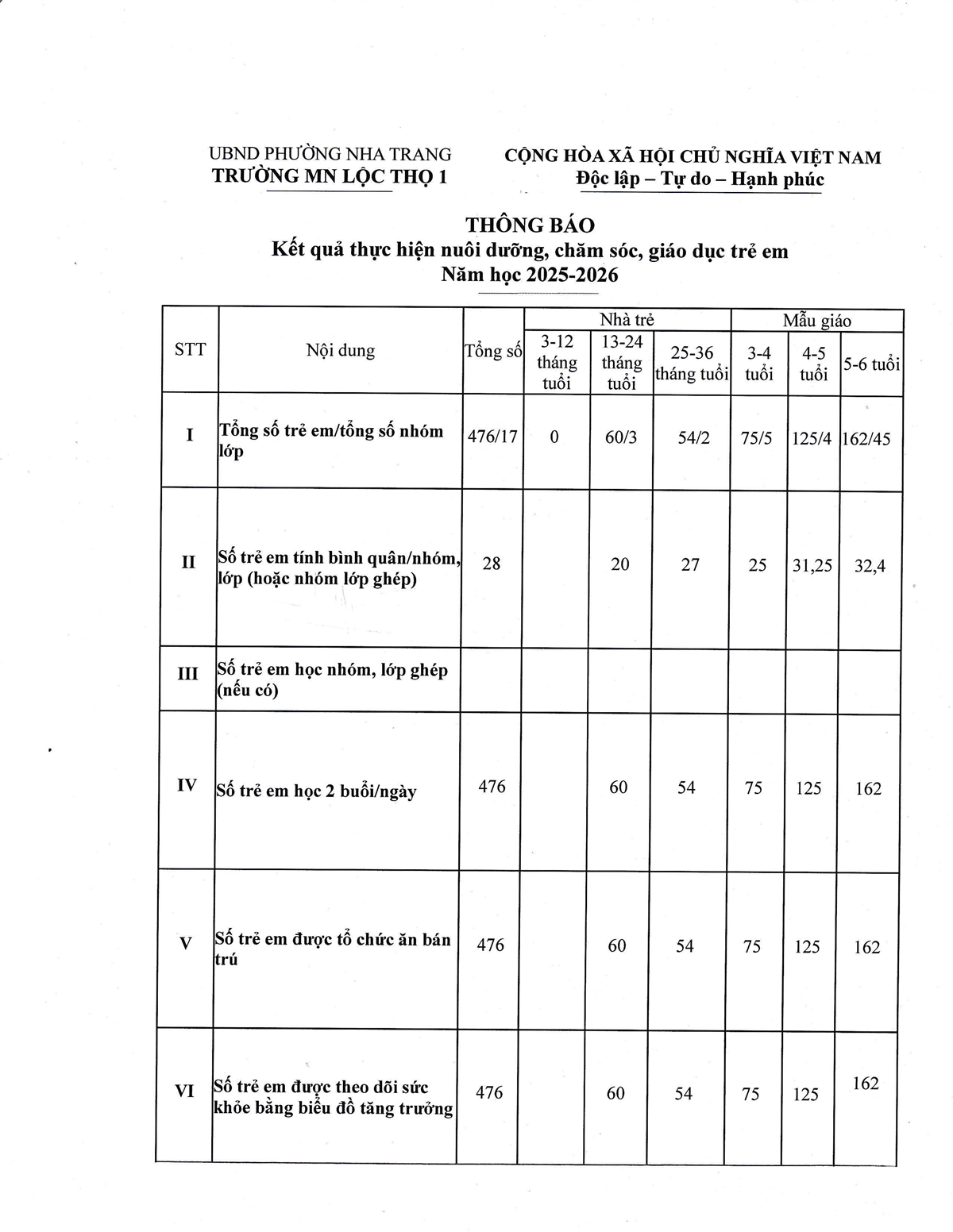 Biểu mẫu 04 - Thông báo kết quả thực hiện nuôi dưỡng, chăm sóc, giáo dục trẻ em
